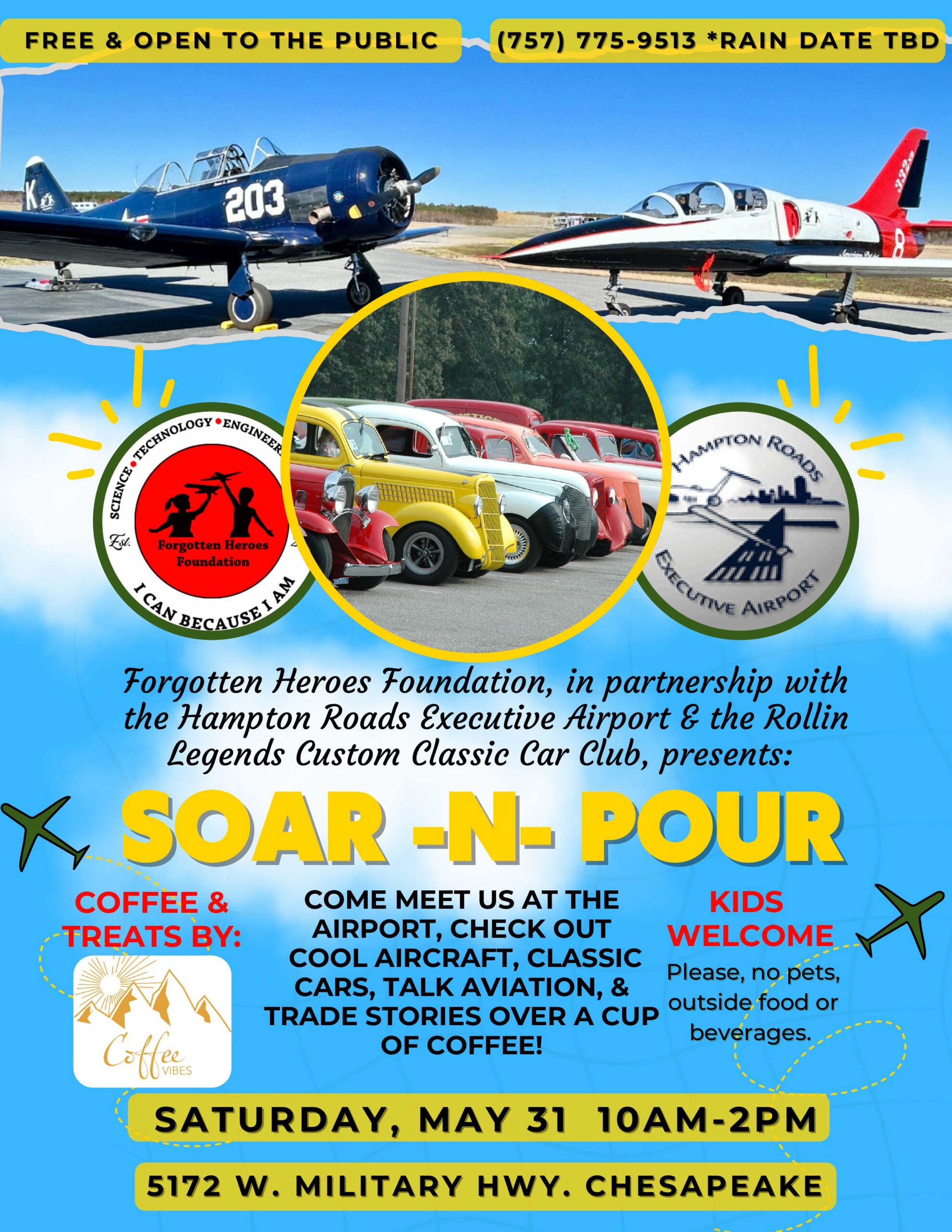 Soar-N-Pour is the perfect blend of aviation, classic cars, and community spirit! Presented by the Forgotten Heroes Foundation, in partnership with the Hampton Roads Executive Airport and Rollin Legends Custom Classic Car Club, this event invites you to the airport to check out incredible aircraft, beautiful classic cars, and connect with fellow aviation lovers. Grab a coffee, share stories, and enjoy an afternoon of excitement